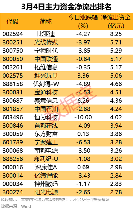 6股净流出超10亿元,新能源汽车龙头比亚迪主力资金净流出居首,达8.25亿元。光线传媒、宁德时代、中国联通主力资金净流出分别为5.71亿元、5.29亿元、5.17亿元。